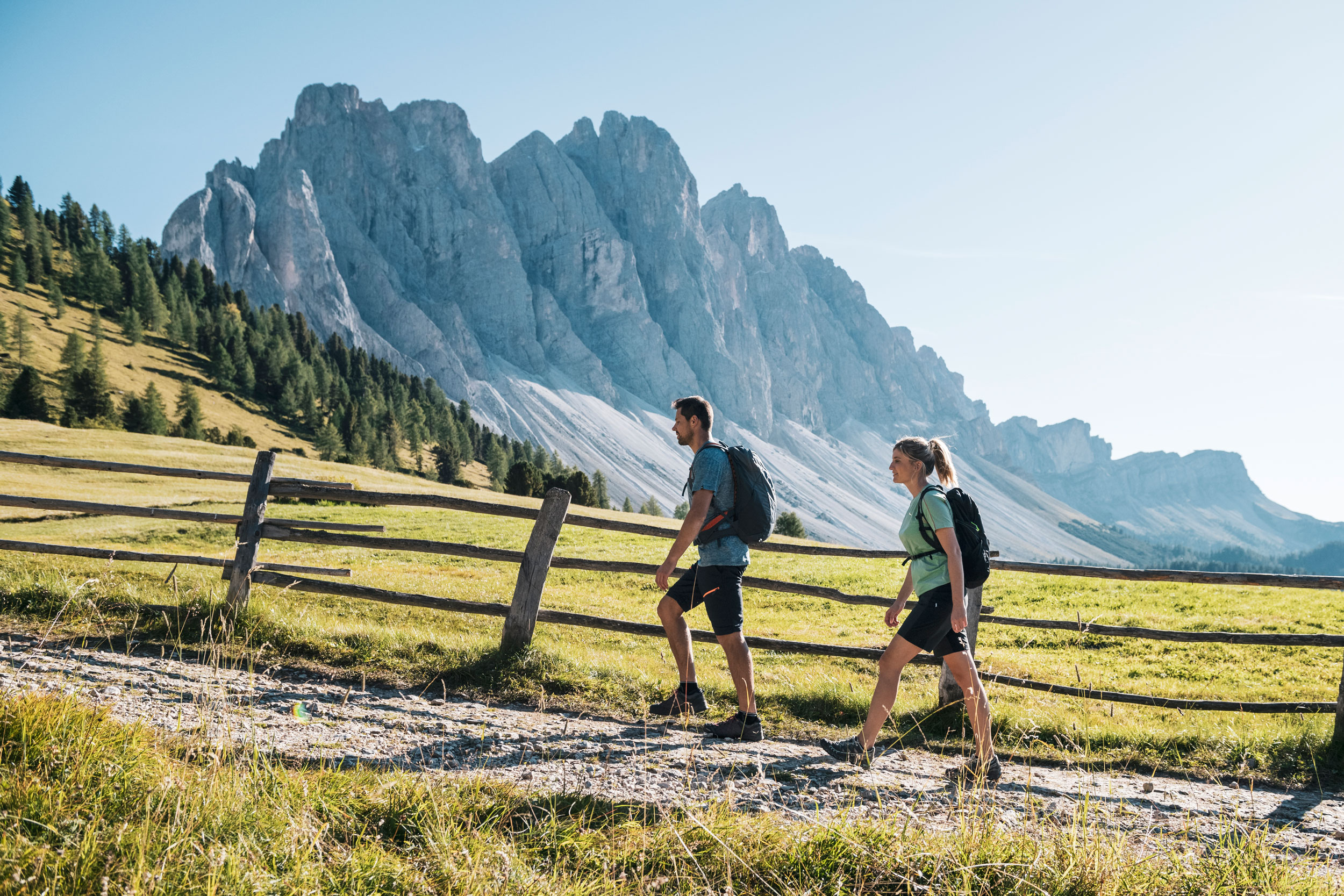From leisurely strolls through the valley to easy alpine hikes, exciting family excursions, fascinating themed trails, and extended Dolomites day trips – a wide range of hiking trails awaits, captivating nature lovers and offering deep insights into a pristine natural landscape. The hiking trails in Villnöss/Val di Funes offer a wide spectrum, from technically easy hikes with gentle slopes to challenging mountain tours with summit ascents. Unique emotions await you as you gaze upon the impressive north faces of the Geisler peaks or the gentle alpine meadows below. Nothing stands in the way of a hiking holiday in the Dolomites.