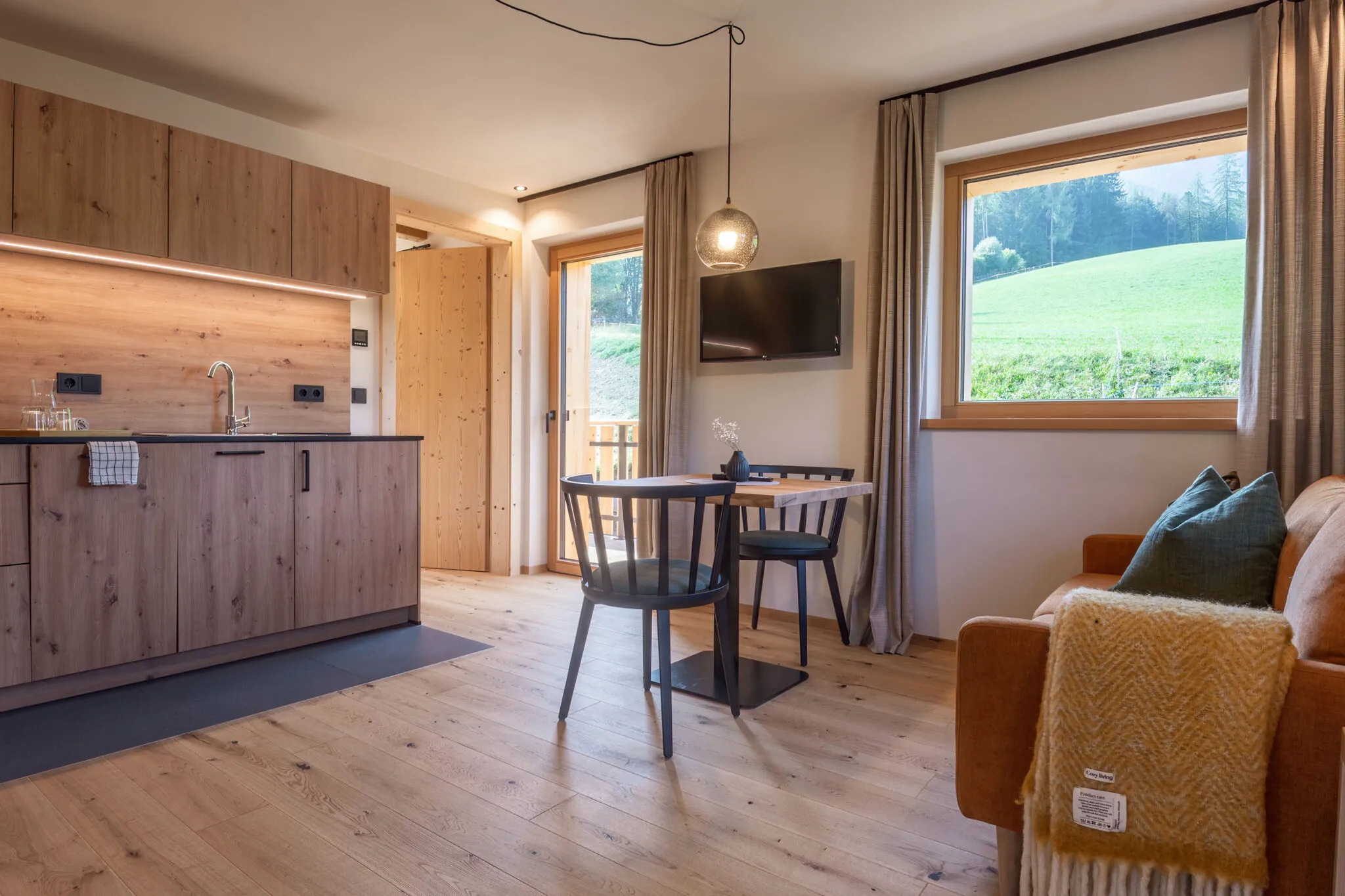 Questo comodo appartamento si trova al piano superiore e offre una bella vista sulle cime delle Odle. È adatto a una coppia: dispone di una generosa cucina abitabile, una camera da letto e un bagno con WC e doccia. La camera da letto affaccia sul terrazzo, esposto al sole di mattina. Il balcone si sviluppa lungo tutto l’appartamento, dà sul verde ed è soleggiato dalla mattina alla sera. “Odla” in ladino significa “ago”: è a questa parola che le cime delle Odle devono il loro nome.